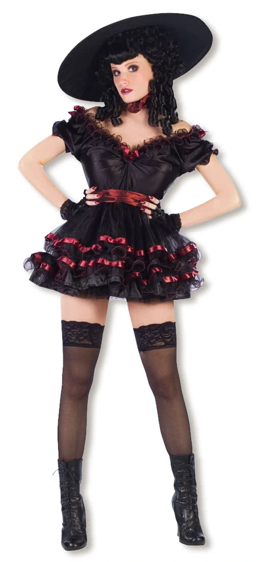 Das sexy Kostüm einer Burlesque Variete Tänzerin besteht aus dem schulterfreien schwarzen Rüschenkleid aus Satin und Tüll mit Bändern und einem Gürtel in Burgunder-Rot. Diese Karnevalsverkleidung wird mit dem großen schwarzen Wagenrad-Hut und den fingerlosen Spitzenhandschuhen komplettiert. Mit diesem Karnevalskostüm kannst du selbst in die Rolle einer Verführerin schlüpfen und wie Christina Aguilera oder Cher den Männern den Kopf verdrehen. Weiße Stopsellocken Perücke , sexy Sexy Netzstrumpfhose Schwarz und Stiefel nicht inkl.