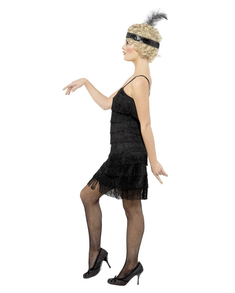 Das schwarze Flapper Kleid wird mit einem Stirnband geliefert, das mit schwarzen Pailetten verziert ist und von einer schwarzen Feder geschmückt ist. Das schöne Kleid hat die typischen in Schichten untereinandergereihten Fransen, die beim Tanzen wunderschän schwingen. Die größenverstellbaren Träger sorgen stets für einen sicheren Halt. Komplettieren kannst du dein Outfit mit dem Langer Zigarettenhalter mit Pailetten und den Satin Handschuhe schwarz.
