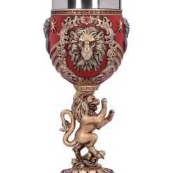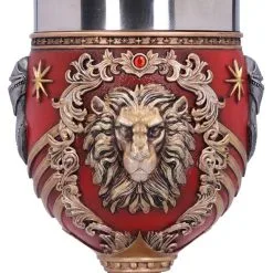 Mit dem Harry Potter Gryffindor Kelch krönst du deine Sammlung deshalb auf besondere Weise. Das Wappentier ist ein Löwe, der an den Seiten im Wappen und als Basis für den Stiel des Kelchs des schön gearbeiteten Stücks zu sehen ist. Der Gryffindor Kelch besitzt die Hausfarben Rot und Gold. Gegossen aus hochwertigem Polyresin, bevor der Harry Potter Gryffindor Weinkelch fachmännisch von Hand bemalt wurde, ist dieser Sammlerkrug die perfekte Ergänzung für jede Harry Potter Sammlung und kann von Hexen, Zauberern und Muggeln gleichermaßen genossen werden. Der Harry Potter Kelch verfügt zum leichten Reinigen über einen herausnehmbaren Einsatz aus Edelstahl.