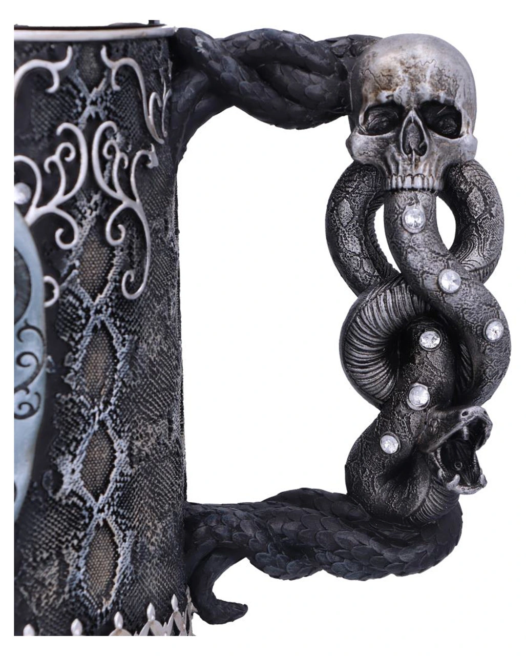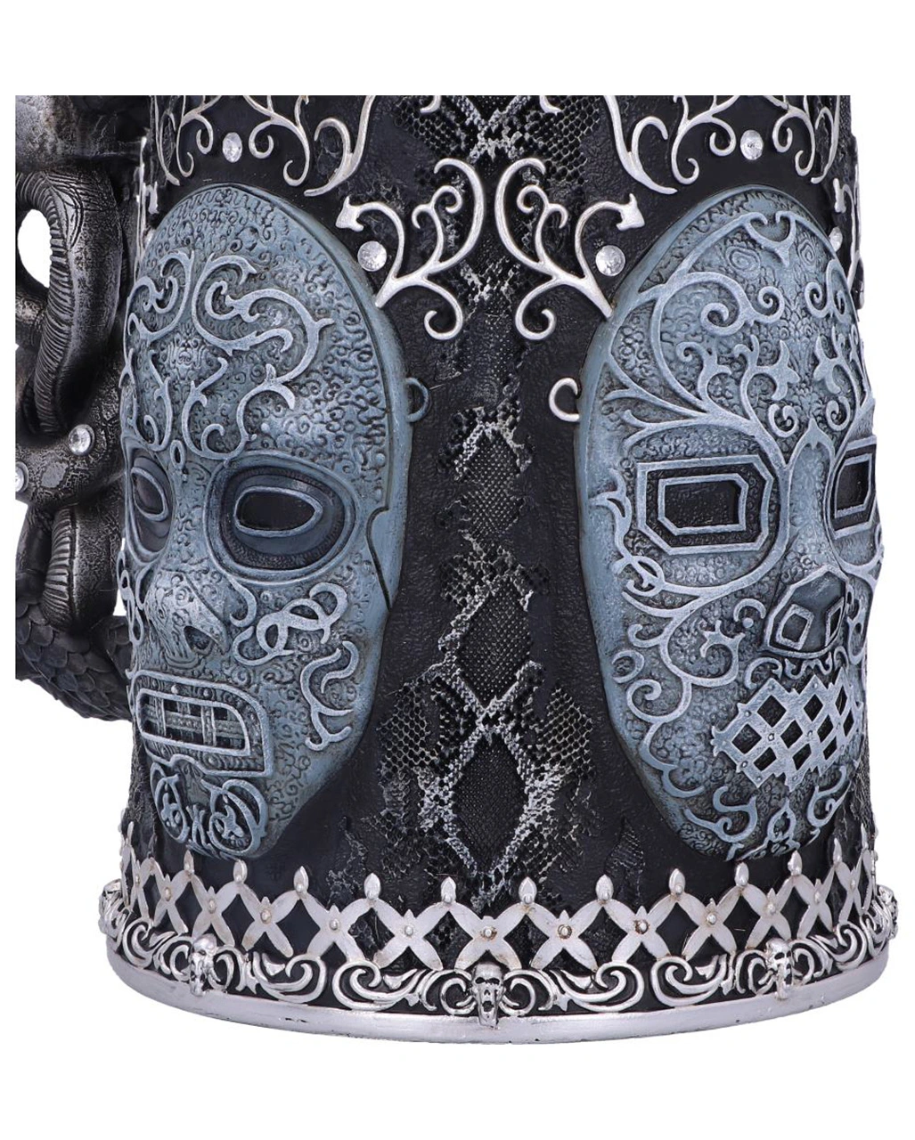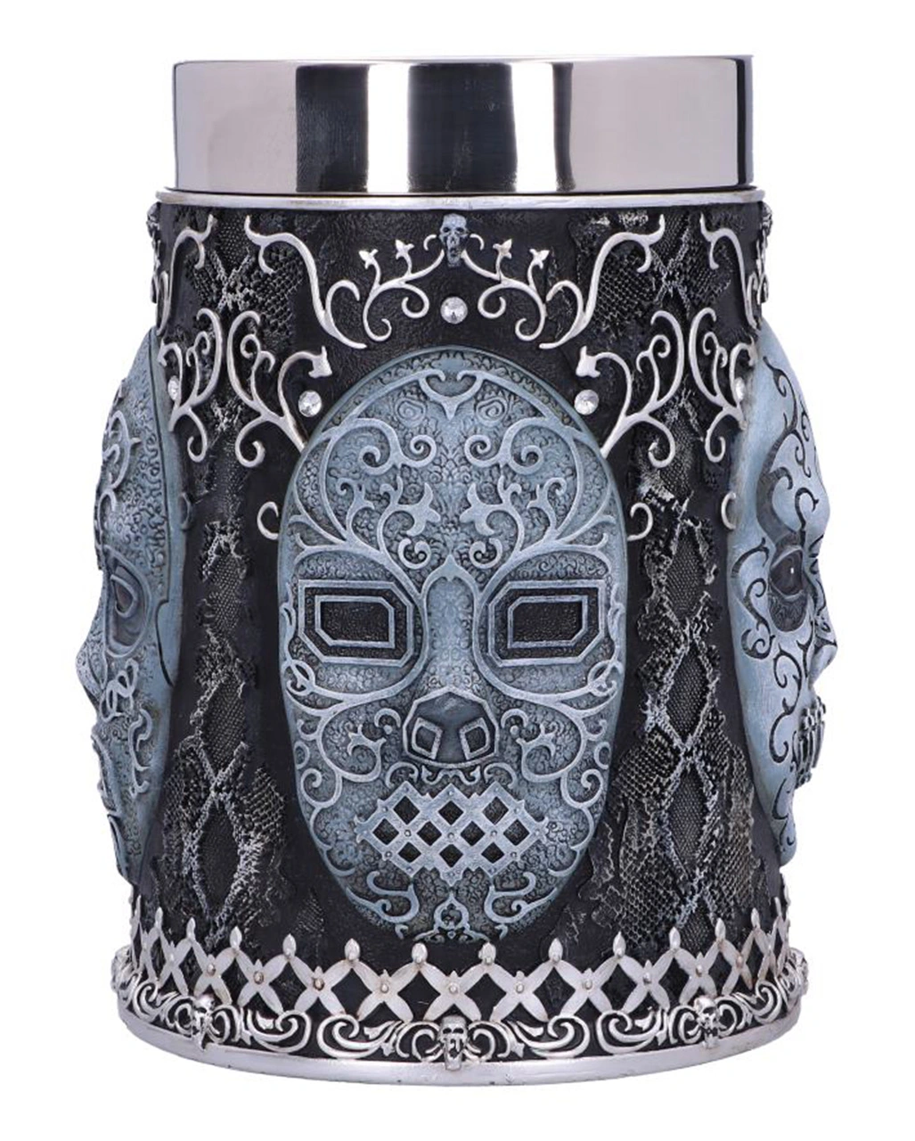 Unser offiziell, lizenzierter Harry Potter Todesser Krug ist das ideale Geschenk für alle, die sich der dunklen Seite der Magie verschrieben haben. Stoße mit dem prachtvoll und detailreich verzierten Krug auf die eifrigen Anhänger von Lord Voldemort an. Die Todesser sorgen mit ihren Masken mit schlangenähnlichen Augenschlitzen für Angst und Schrecken. Ihre Abbilder sind jetzt auf den Seiten dieses prunkvollen Sammler-Kruges zu sehen. Der mit grünen Juwelen verzierte Griff zeigt außerdem das schlangenförmige Brandmal, das gewöhnlich in den linken Unterarm der Todesser eingebrannt wird.