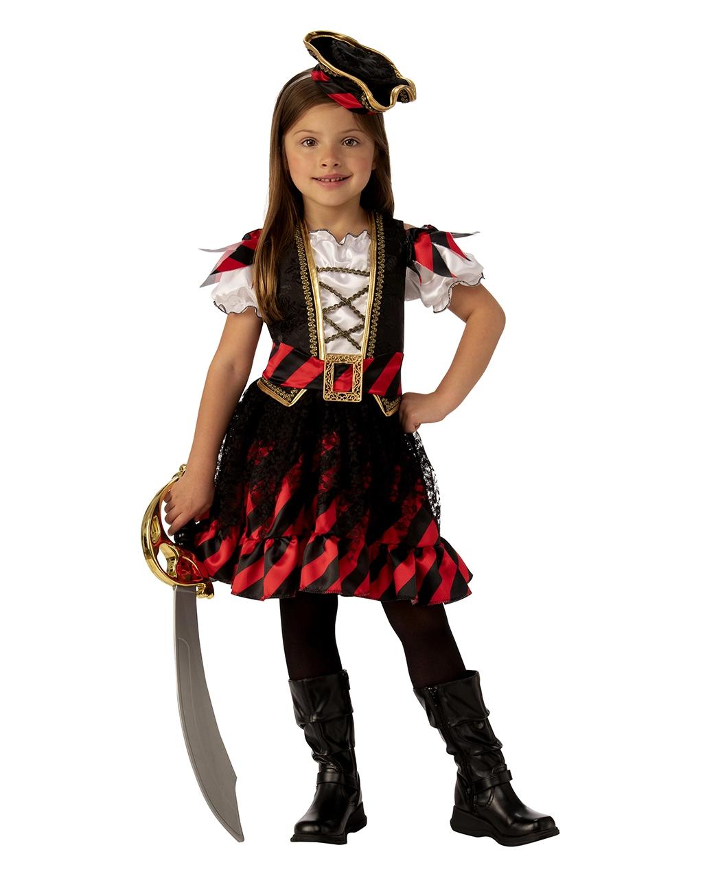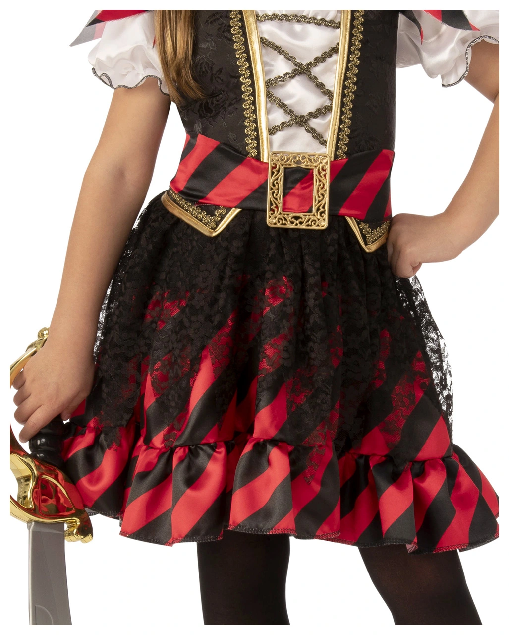 Das Kleine Piraten Königin Kostüm für Kinder ist eine Piraten Verkleidung für Mädchen. Im Brustbereich findet sich eine Kreuzschnürung. Niedliche Puffärmel und eine Goldborte sorgen für Akzente. Der rot-schwarze Rockteil ist ca. knielang und etwas voluminöser. Ein Piraten-Gürtel sorgt für perfekten Halt. Deine Tochter kann sich auf ein bequemes Trageerlebnis freuen und ungehindert toben! Du erhältst die Piraten Mädchen Verkleidung in Größe XS-L. Hierzu passt das Faschings Kinder Make up Set. Für gefährlich aussehende Narbe solltest du auch das Zombie Piraten Tattoo Wunden hinzufügen.
