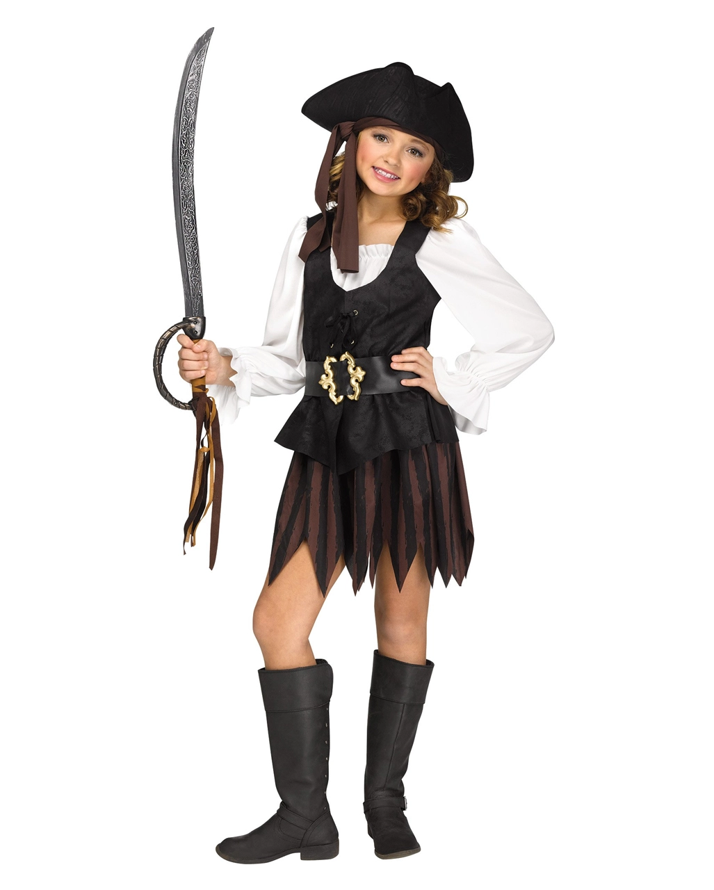 Ahoi! Vielleicht feierst Du ja auch Deinen nächsten Geburtstag unter dem Motto “Seeräuber und Piraten”. Was immer ihr auch im Schilde führt, das Mädchen Kostüm rustikale Piratin ist eine originelle Verkleidung für die Kinder-Faschings- oder die Kostümparty. Das Kostüm besteht aus dem braunschwarzen Kleid mit angenähter weißer Bluse, dem Piratenhut sowie dem passenden Gürtel mit dicker goldener Schnalle darauf. Natürlich fehlt auch das braune Band nicht, das Du unter dem Hut um die Stirn bindest, nicht bei diesem tollen Kostüm Set einer echten Piratenlady. Der Piraten Schwert aus Schaumstoffwürde das ganze dann natürlich noch komplettieren.