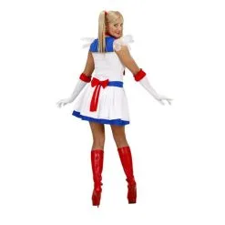Unser Manga Schülerin Kostüm wurde im Stil der japanischen Schulmädchen Uniformen gefertigt, das heißt, zum Kostümset gehören ein Minikleid, ein Paar Handschuhe und ein Halsband. Das weiße Kleid wurde mit blauen Einsätzen am Dekolleté, an der Taille und am Saum verziert und wurde zusätzlich mit zwei kleinen Flügeln versehen, denn ein Super Hero muss ja auch fliegen können. Die Handschuhe passen mit ihren roten Streifen perfekt zum roten Halsband und zur roten Schleife des Minikleides. Die Plateau Pumps mit Schleife, die Sailor High Heels oder die Plateau Lackstiefel weiß Gr.40-42 ergänzen dein Manga Schülerin Kostüm.