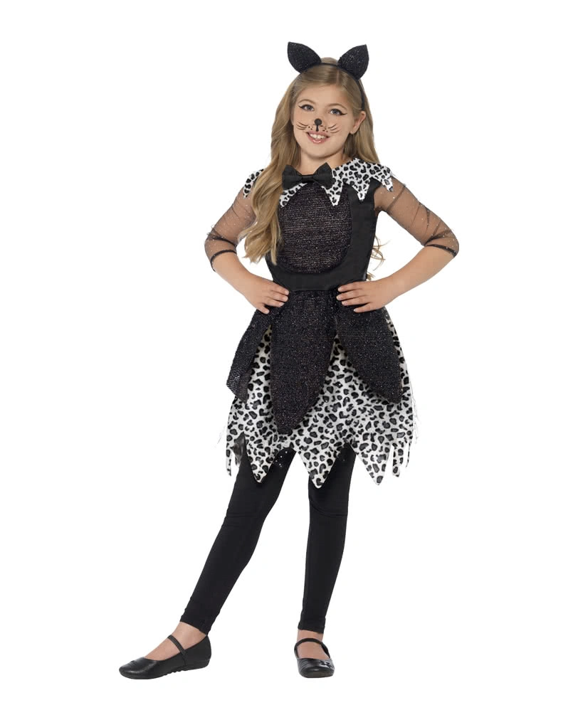 Das Mitternachtskatze Mädchenkostüm ist zweitteilig und besteht aus einem schwarzen Haarreif mit glitzernden Katzenohren und einem schicken schwarzen Kleid mit halblangen schwarzen Tüllärmeln mit silbernen Glitzerpunkten. Der Halsausschnitt ist mit einem spitz zugeschnittenen Kragen im weiß-schwarzen Leopardenlook und einer schwarzen Fliege verziert. Das schwarze Oberteil hat das katzentypische Lätzchen aus Glitzerstoff. Der weiße Rock ist im Leopardenlook und hat eine darübergelegte schwarze Tüllstoffschicht, die glitzert und drei schwarze darübergelegte Glitzervolants. Auf der Rückseite des Kleids ist ein kurzer, schwarz glitzernden Katernschwanz angebracht. Für den Partnerlook mit der Mama, empfehlen wir das Sexy Cat Kostüm Gr. 36-38 S/M.