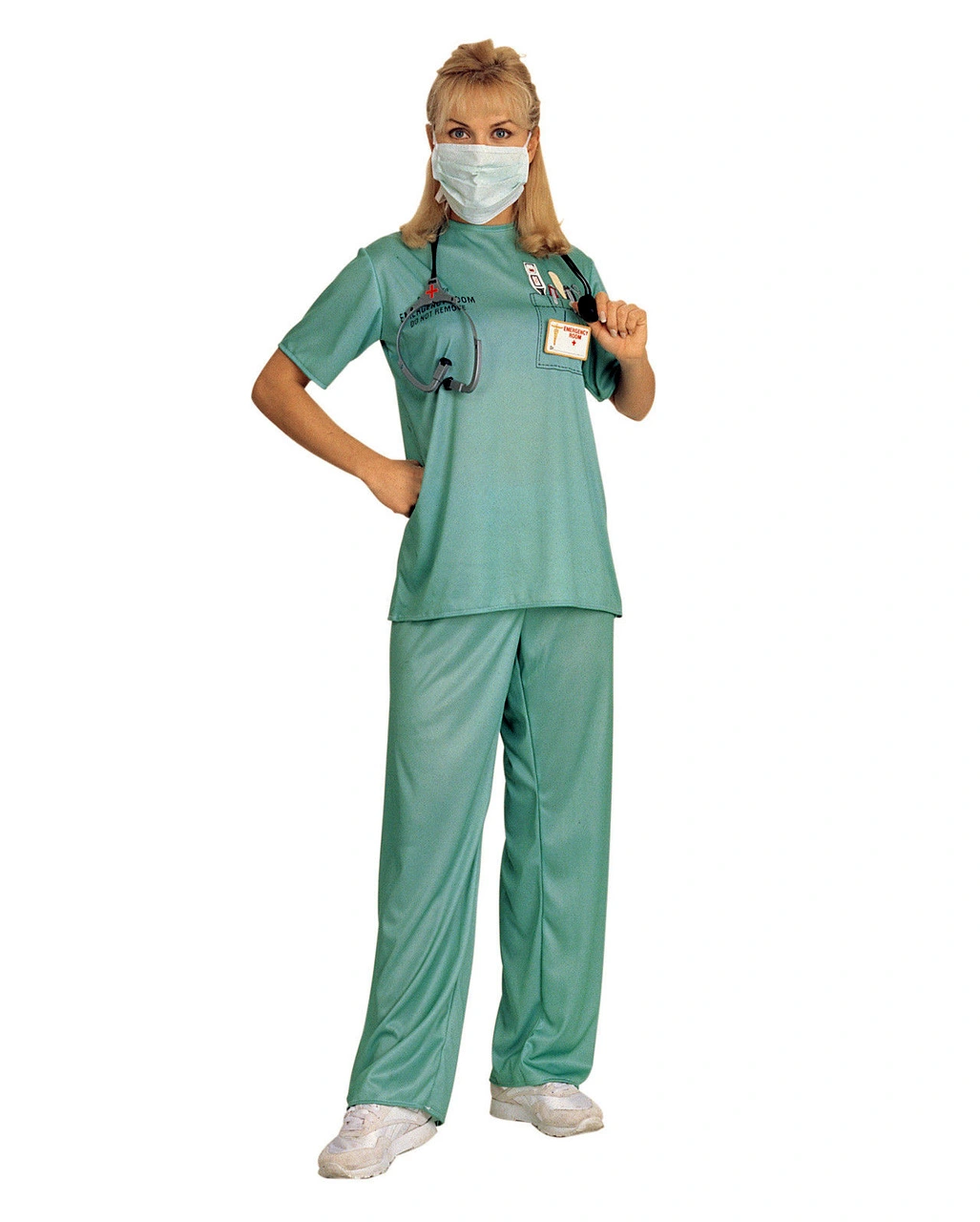 Das OP Schwester Kostüm ist ein Komplett-Set aus grünem OP Kittel mit Namensschild, der dazu passenden grünen OP Hose, einem Stethoskop und dem zum Kostüm gehörenden Mundschutz.