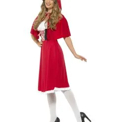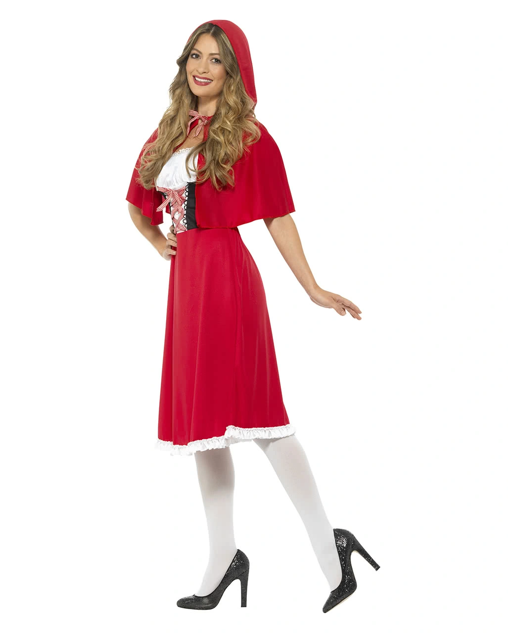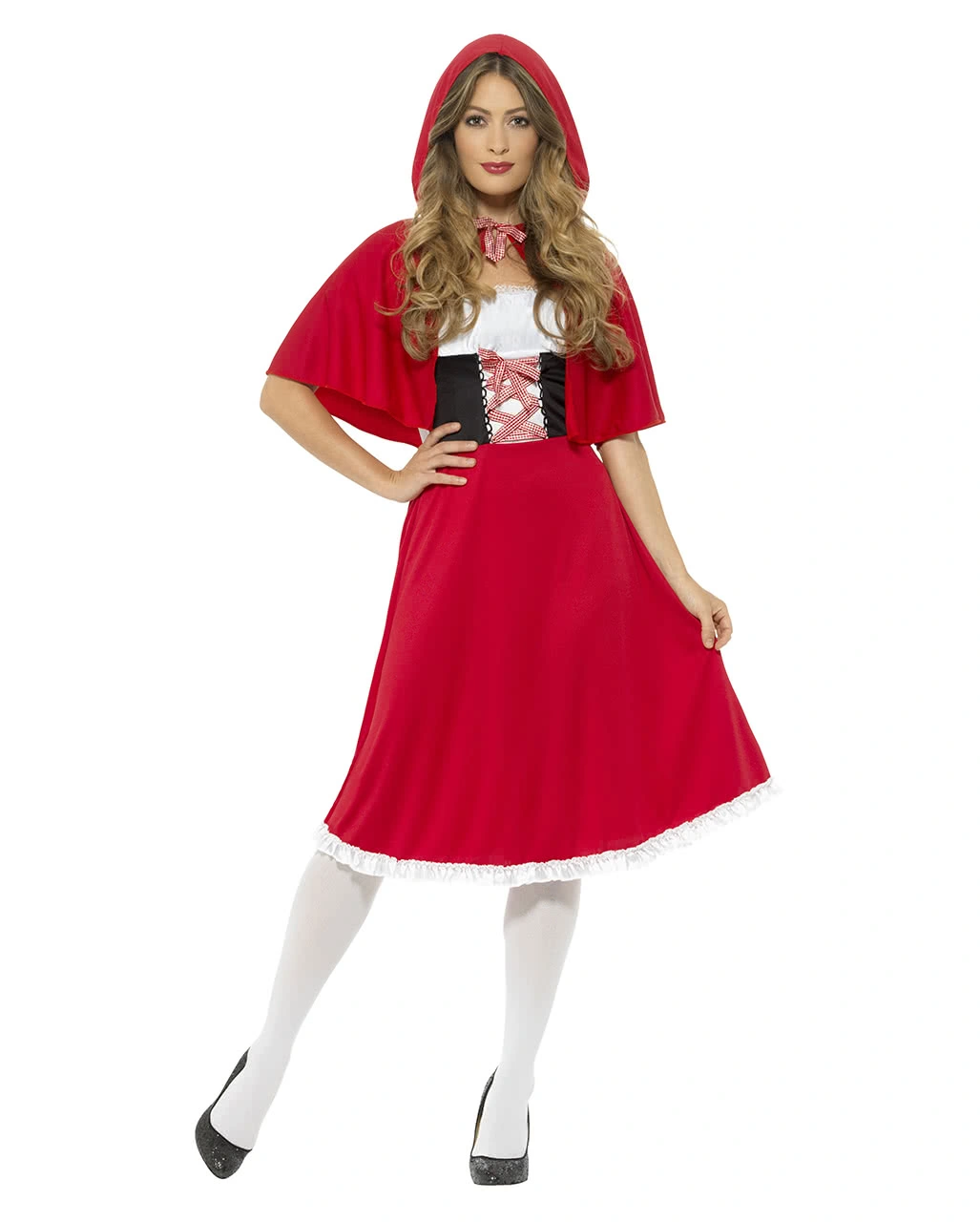 Das Rotkäppchen Kapuzen-Kostüm besteht aus Kleid und Kapuze. Das Kleid ist im charakteristischen Rot gehalten und mit Spitzenbesatz an Oberarmen und Dekolleté verziert. Die Ärmel der Rotkäppchen-Verkleidung bedecken lediglich die Schultern. Eine stilisierte Corsage samt rot-weiß-karierter Schnürung sorgt für ein stimmiges Aussehen des Märchenkostüms. Ein Reißverschluss am Rücken des Kostüm-Kleides erleichtert das Anziehen und ein weißer Saum schmückt die Faschings-Verkleidung zusätzlich. Die Kapuze ist wie ein Reiterumhang geschnitten, sodass die Oberarme bis ca. zu den Ellenbogen bedeckt werden und lässt sich vorne zusammenbinden. Dazu passen der Rotkäppchen Picknickkorb mit Wolf und ein Böser Wolf im Oma Kostüm.