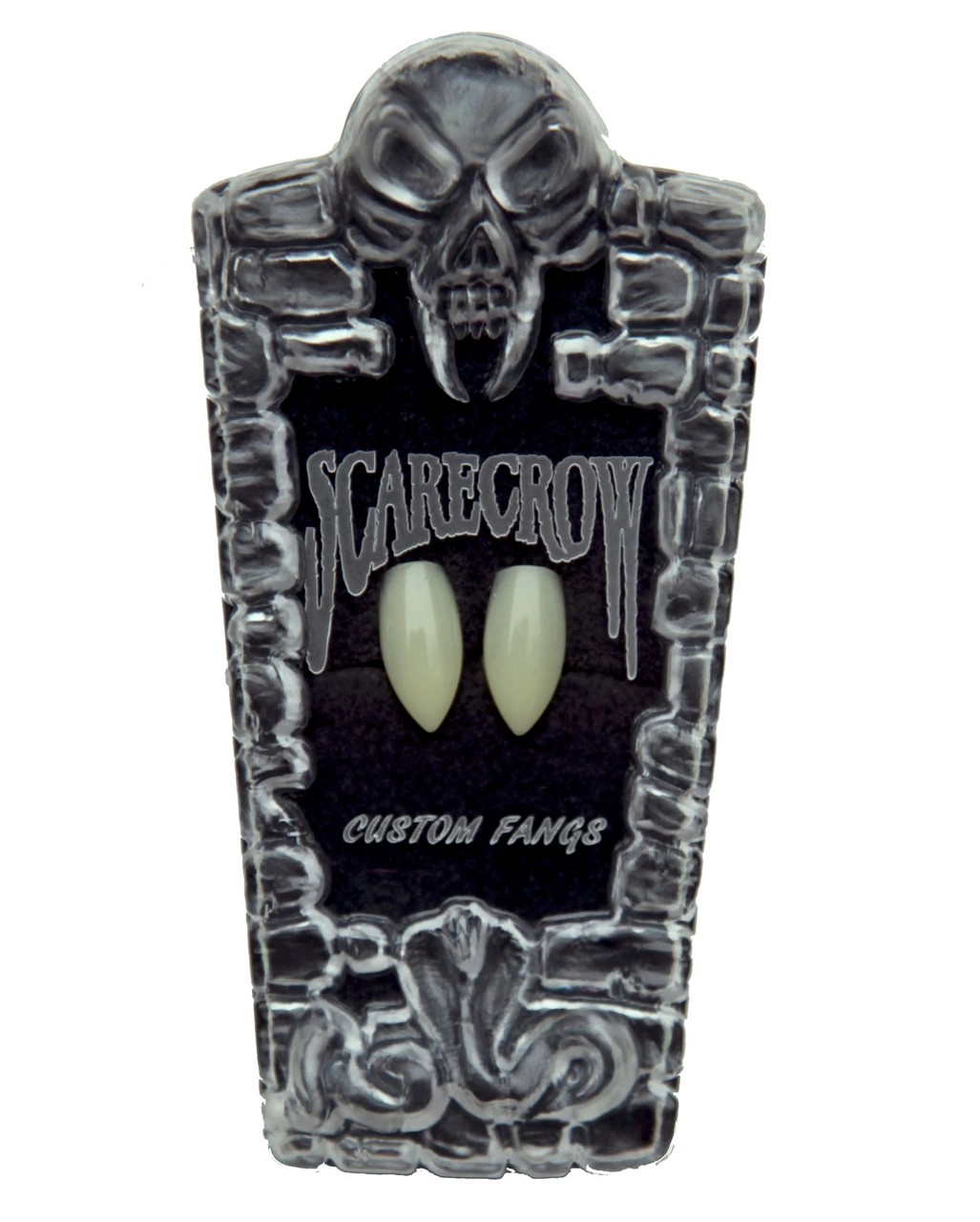 Die Vampir Zähne von Scarecrow mit US-Patent sind damit die besten Vampirzähne, die auf dem Markt erhältlich sind. Die im dunklen leuchtenden Vampir Eckzähne haben die Größe von regulären Vampire Fangs und erzielen ihren Effekt im UV und Schwarzlicht. Die “Glow in the Dark” Dracula Zähne lassen deine scharfen Beißer im UV-Licht besonders auffällig erscheinen und machen dich damit zum perfekten Halloween Vampir. Die professionellen Scarecrow Vampirzähne werden auf Grund des fantastischen Aussehens in der Hollywood Filmindustrie auch von den Schauspielern von Twilight, True Blood und Vampire Diaries getragen.