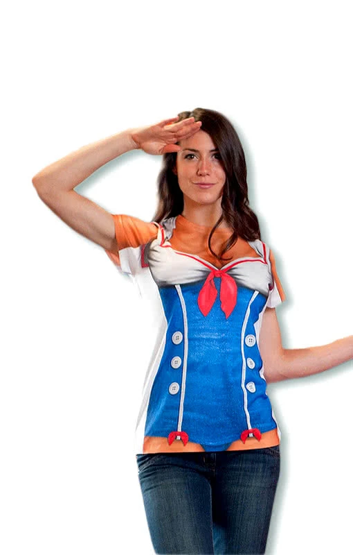 Das Seemannsbraut Shirt hat vorne den Aufdruck eines sexy Matrosinen Körpers der in einem knappen blauen Kleidchen steckt. Das Dekoltee ist weiss und wird von einer roten Schleife verziert, die bis in den blauen unteren Teil des Kleids hängt. Auf diesem sind zwei Knopfleisten gezeigt, an deren Ende wieder zwei kleine rote Schleifen hängen. Am Rücken ist eine Scherpe abgebildet die ein Ancker schmückt, links und rechts jeweils ein Stern. Das Matrosen Hütchen passt super zu diesem Artikel.