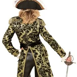 Der silbern-schwarze venezianische Damenfrack ist aus schwerem Stoff gearbeitet und besitzt ein wunderschönes florales Muster aus silberner Stickerei auf schwarzem Stoff. Die Verzierung aus Silberborte sowie die Metallknöpfe ergeben zusammen mit den Schulterklappen und deren Fransen einen eleganten Look. Optisch erinnert der Parade-Tailcoat sofort an schwere Brokatmäntel und eignet sich daher perfekt für Figuren aus der Zeit des Barock und Rokoko. Mittels eines geschickt versteckten Reißverschlusses kannst du deinen Brokat Frack schließen. Dank eines taillierten Schnittes wirkt der Piraten Frack keinesfalls sackig. Dazu passen ein Edler Musketierhut mit Feder und Piraten Damen Stiefel.