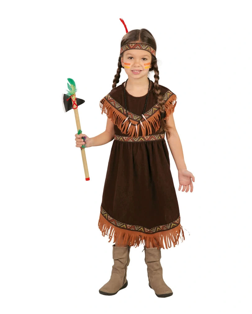 Die erstklassige Sioux Indianerin Kinderverkleidung besteht aus einem dunkelbraunen Kleid mit hellen Fransen am Saum und im Brustbereich des Kleides. Schmückende Stoffstreifen mit typisch nordamerikanischen Indianermotiven verlaufen um den Saum, die Hüfte und die Brust. Das Muster sieht man auch beim Stirnband. Der Kopfschmuck weist im hinteren Abschnitt ein flexibles Band auf, damit es auf verschiedenen Kopfgrößen passt. Eine Squaw Kinderperücke oder vielleicht eine Squaw Zopfperücke runden das Sioux Indianer Kostüm für Mädchen ab.