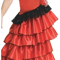 Das Spanierin Kostüm besteht aus einem roten Satinkleid im Flamenco Stil. Der Rock wurde mit den charakteristischen Volant designt und als oberste Schicht wird ein schwarzer Stoff als kontrastreicher Abschluss mit Glitzerpunkten und einer Rose aus Tüll genommen. Dieser schwarze Stoff wird auch noch einmal am Dekolletee verwendet. Das Senorita Kleid ist asymmetrisch geschnitten und wird auf der rechten Seite durch einen durchsichtigen Träger gehalten. Als kleines Accessoire ist dem Flamenco Kostüm eine Haarspange mit Rosenverzierung bei gefügt, die du hervorragend mit der Gekräuselte schwarze Kinder Zopfperücke kombinieren kannst.