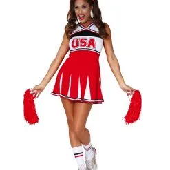 Sportliches Cheerleader Kostüm besteht aus elastischem, weichen Stoff und wird wie ein Shirtkleid angezogen. Das Cheerleader Kleid hat aufgenähte Zierbänder am Saum. Außerdem ist die Aufschrift USA an der Front aufgedruckt. Das Cheerleader Kostüm wird mit Bändern im Rücken gebunden und ist in S-XL Größe erhältlich. Hierzu passt die Cheerleader Perücke blond ideal.