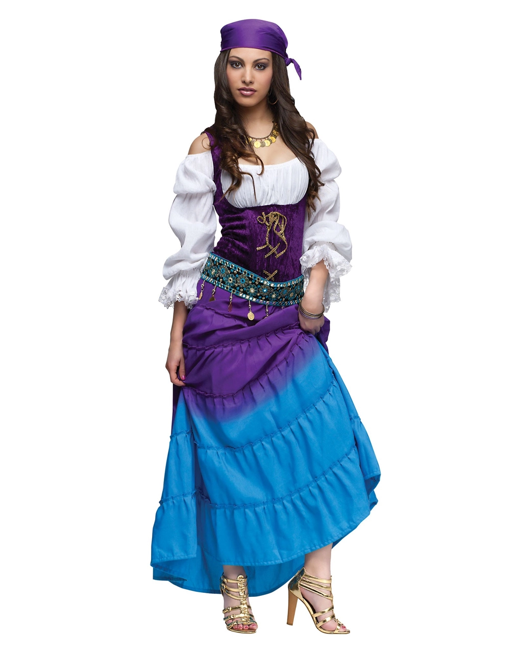 Das Wahrsagerin Verkleidung Premium ist ein hochwertiges Highlight auf jeder Motto Party. es besteht aus einem toll gearbeiteten Kostümkleid, das im Mittelteil durch seine Korsagenoptik eine sehr schlanke Taille zaubert. Der lange Rock in Himmelblau wird ergänzt durch das Oberteil in leuchtendem Lila. Die weiße Bluse lässt die Schultern frei zaubert ein tolles Dekolte. Stilechtes Detail ist zum einen der wunderschön bestickte Gürtel sowie das Kopftuch das ebenfalls durch das leuchtende Lila begeistert. Passend dazu würden Dir dieZigeunerin Münz-Kette als Schmuck und die Schwarze Langhaar Perücke empfehlen.